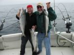 Gale force winds will change everything. The water temperature will be the key to finding fish on your next trip out. As of Sunday morning the warm water is in and the fish were out. A temperature break was in 100 to 140 feet of water. The best action for Chinooks was 55 to 120 down. Magnum spoons the best option for all size fish. Jeff and Andy Georgin of Cincinnati had a great morning with some nice Chinooks.