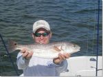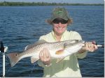 We made another move which put us further ahead on the tide. I carved a ladyfish and made a long distance cast with it. It hit the water and kept on going. Redfish on. Larry was pretty thrilled, and definitely impressed with the fight of that redfish, which ultimately measure just under 28 inches. She posed for a picture or two, and was released to fight another day.