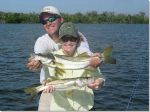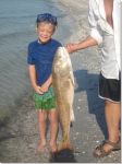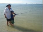 Butch: Yeah, I know my brother John would love to get back out with you so I am hopeful I can work out something out with him when we make our annual pilgrimage to Sanibel next year. The red was over 35" long, but having grown up with sisters and having been married as long as I have, I learned long ago not to guess weight even when prompted! He was a brute though, even more amazing is that he was caught on a kids fishing pole with I guess no more than 6# test and a closed face reel. I attached a pic of Dom with his little pole retrieving his gold spoon just prior to this guy hitting.... Feel free to use the pic, as I know Dominic will be thrilled that he was on the same report his uncle was on a couple years ago..... I know that in these are tough times a quality guide like you will weather the storm. It is a true testament to the type of guide you are! Jerry.