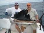 Craig Liszt, Rich Rusak, and Pat Conway fished a 3/4 day trip. The main goal was to catch a sailfish and also catch a few fish to take home to eat. Bait was a bit more difficult on this trip, but we finally hit a good load of pilchards and off we went. The forecast of seas 2 feet or less turned out to be 2 - 4 feet. This actually worked out to our advantage and it put the fish in a much better feeding mood. After putting out the first two flatlines, we had a 25 foot whale shark swim up to the boat. What a beautiful enormous creature. Everyone had their cameras out and were snapping lots of pictures when I saw a cobia tagging along with the whale shark. It initially refused our bait. Meanwhile, the whale shark bumped the engines once and the side of the boat another time. It swam off and came back several times. On it's third return trip, the cobia ate a pilchard and we thought we were in for a battle. The fish just swam in circles next to the boat. I got a large gaff and stuck the fish pulling its tail out of the water. The fish went nuts and I held on. I yelled for another gaff and stuck the fish again and put the 35# cobia in the boat and into the fish box. What a great way to start the trip. All the lines were put back out and the bottom rod saw first action with a kingfish. Then it was another kingfish followed by a nice size mutton snapper and then a summer size bonito. The downrigger scored the third kingfish before we finally had a flatline get hit. It turned out to be a bluerunner. Along the way, we missed the hook up on two fish on the downrigger and one on the bottom rod. It was time to call it a day when a flatline got hit and it was the other fish we were looking for. The sailfish put on a spectacular aerial show and dumped lots of line off the reel while we pulled in all the other lines. We gave chase and slowly started winning the back and forth battle with the sail. It sounded twice during the fight before staying on the surface for the remainder of the fight. After several pictures, the fish was released to thrill another angler on another day.