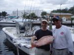 Fernando Godinez, his father-in-law Larry Hofmann, Larry's 10 year old grandson, Lyndon Hofmann, and friend Robert Abramitis fished a 1/2 day in the afternoon. We loaded the livewell with pilchards and ran offshore starting in 160 feet. Our first action came on the bottom rod in the form of a kingfish. Lyndon had first honors and whipped the king in nothing flat. Moving out to 200 feet, the downrigger scored next with another kingfish. On the next drift, the bottom rod took off like crazy. Lyndon used all the strength he could muster to turn the handle. The fish kept taking line and soon he needed some help. While Robert was putting on a rod belt, I managed to turn the fish's head and get it coming up, at least temporarily. Robert took over and felt the power of the fish immediately. He kept up steady pressure as the fish slowly began to give in. Once we got the sinker to the surface, I grabbed the leader and finished pulling the 40# amberjack to the surface and put it in the fish box. We finished the trip with making a couple of drops on several wrecks. We had a goggle eye get crushed and spit out, however, we did not hook up.