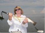 We left the dock at 0600 hours and headed straight to B Span flats to catch bait. The combination of tide running one way and the wind the other made bait a bit tricky, but we put a ton of it into the well before it was over. We'd had trout once again popping around us as we caught bait, but not as frequent as the week before. So, once I had the boat cleaned up we sat right there and let Alison catch a bunch of trout and get used to the gear and techniques again.