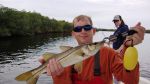 Mild temperatures and light winds greeted my anglers at 7:30. Bridget and Chris from Virginia were onboard and looking forward to seeing what Tampa Bay had to offer. With the water temperature a chilly 57 I opted for shrimp just in case we could not find any white baits. A quick run to the Skyway Bridge and 3 tosses of the cast net and we were ready. Chumming wasn’t necessary as my bottom machine was marking lots of bait. We ran North near Apollo Beach for our first stop. With a low tide of -.09 many of the areas we fished the last few months were high and dry. During these winter low tides it’s important you know how and where you can safely navigate. Our 3rd bait in resulted in a snook blowing up on the white bait not 15’ from the boat. Not 5 minutes later Chris was fast into a frisky 23” snook that did not throw the hook this time. Chris was fishing the deepest water in the area. Next cast he scored a chunky spotted sea tout quickly followed by several more snook. Chris had the hot hand and could do no wrong with snook. Bridget finally got on the board with a feisty trout pushing 18”. We then targeted rivers looking for warmer water. Chris once again was red-hot quickly catching a several redfish completing his Tampa Bay Grand Slam. By noon we landed 15 snook, very good considering snook get very lethargic in cold water. Our taxtics were simple focusing on dark muddy bottoms that hold heat . Snook were tight against the mangroves with deep cuts. Capt. Steven