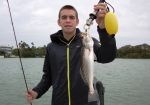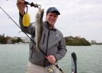 Saturday’s weather was miserable at best. No sun, lots of wind and rain on the way said it all. We had two super guys onboard today, Cal and his son Lucas from Oregon. A friendly wager for first fish, most fish and the largest fish between father and son got off to a fast start. Lucas first cast had a fish on within 5 seconds but lost it boat side. It took more than 5 seconds for the next bite. Lucas caught several more only to have them get off again at the boat. Cal did not let that occur and won the first phase! We were tossing live shrimp on 1/0 hooks with 1/16oz weight in 5-10’ of 62 degree waters. With the tide a very low -.08 most flats were bare or had very little water pushing redfish and trout to deeper pockets. Cal and Lucas dealt with a rocking boat and stiff winds with quality cast after cast. Cal’s enthusiasm in poor conditions was infectious, first mate Chris and I really wanted to get these guys on the fish. The first couple of stops were slow resulting in a few small trout. We moved to a deep canal and quickly found feisty trout to 16” and ladyfish. We stitched from bait to DOA CAL jerk baits and the action picked up quickly. The weather was getting worse so I picked up and ran to a spot near the marina that had been red hot lately. The wind was so brisk now that the power pole would not hold us in place and we quickly were moved out of the strike zone. The rain started so we wisely called it a day. Overall we took approximately 15 trout and 6 ladyfish during our 5 hours on the water. Captain Steven