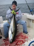 After we had donated about 4 packs of hooks to the kings and sharks, we got our first fish on but I thought I saw a bonita take the bait and then a shark was chasing it. After the fish took off like crazy, we thought ok, the shark has it now! Like a fool, I push the drag to full so we can make quick work of this shark. We did make good time on bringing the fish up but this shark had yellow fins hanging off of it! We were able to hook up and land one more after that and then the sharks took over.