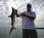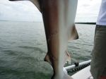 Back to looking for redfish on a local mangrove, oyster lading island. We saw 3 large 40” bruisers with no takers. Back on of my favorite flats action was awesome. Trout, Mackerel, Ladyfish and Black Tip sharks made for lots of light tackle fun. I deployed the Power Pole in 7’ and worked baits under a float from in 5 to 8’ of water loaded with glass minnows. The Black Tip sharks exploded upon hookup maybe several exciting jumps. One shark had been bitten by another shark!