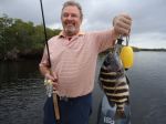 Terry’s rod bent deeply looking like a nice red but it turned out to be a 7 pound sheepshead. At 7 pounds a true trophy, Terry then nailed another that was pushing 7 pounds. Within 15 minutes Terry once again was fast to another solid fish. I was positive it was a redfish then my jaw dropped to see a monster sheepshead that had to be 10 pounds! I had my Boca ready only to have the giant come unbuttoned boat side.