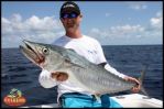 Over dinner last night Darin and I decided that for Day 2 we would run 30 miles NE to the tuna grounds. Rumors were that the yellowfin tuna were around so we took the gamble and made the big run in the morning. For the first 2 hours the only thing we caught was a tan until I spotted a group of birds. I headed in and ran circles around the birds, getting a bite on a horse ballyhoo using a 30-lb. rod. I was fighting a 50-lb. yellowfin tuna for 35 minutes, long enough for us to lose track of where the birds were. Searching for the rest of the day, it was around 5PM when I found them again and we ended up catching 7 yellowfin tuna. One fish that Darin caught on a 20-lb. spinner easily weighed in at 70-lbs. - minus the shark bite taken out of its side! During all the mayhem we had seen a Great White shark cruise along the side of the boat, no doubt grabbing a little free lunch. An awesome sight to end a great trip- it’s better in the Bahamas!