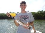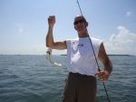 We ran 8 miles across the Bay to the deep Grass flats around Port Manatee that was red hot the day prior. Water temperatures were still down from last weeks rains at 86 degrees. Hudson was the first in the water and before I baited another rod I heard the drag pulling. Great the fish are right were we left them. Not! Turns out it was a catfish and not the trout I was confident we would catch. Next the wind stopped so we had a combination of slow action and hot hot weather. Then the smallest trout I ever seen was fought and landed. I want mention any names!!!